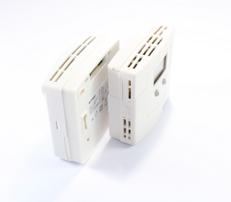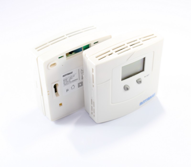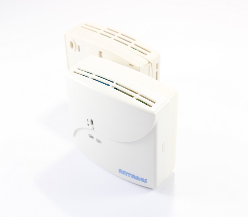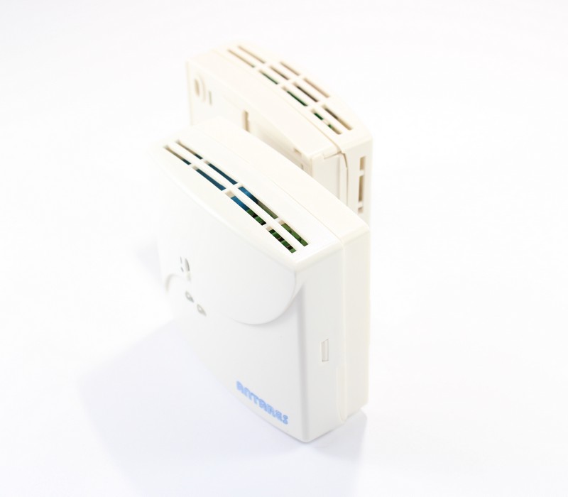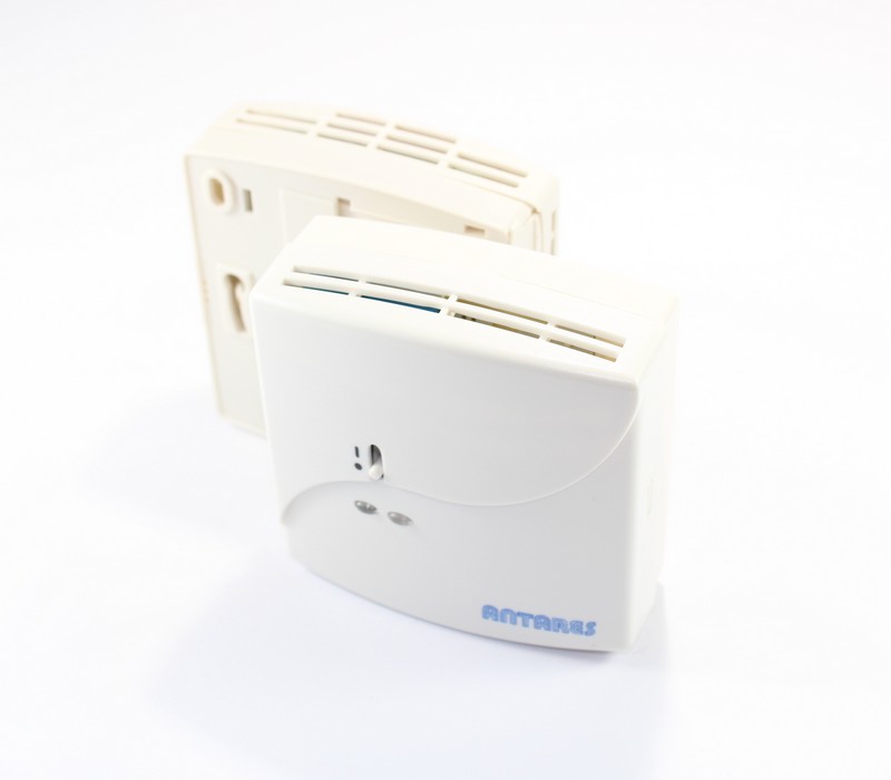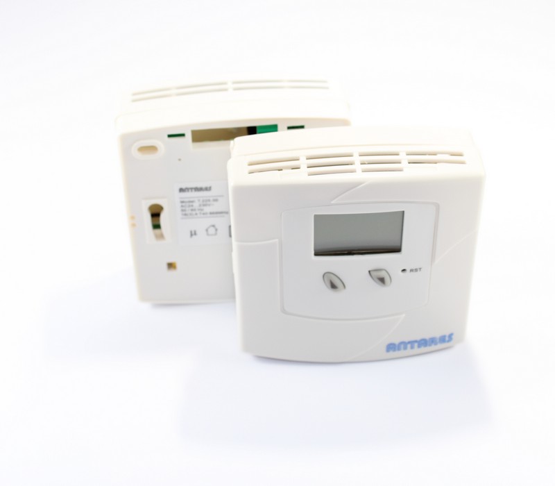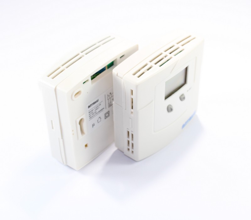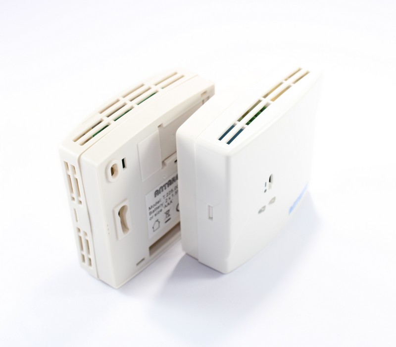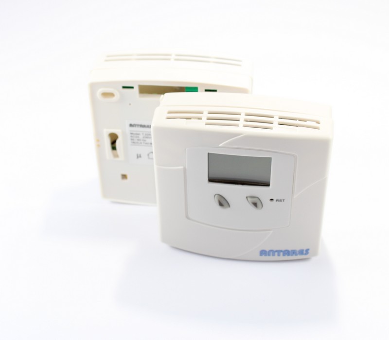 Der Thermostatsender ist Batteriebetrieben 2x AA, der Empfänger ist mit Stromspeisung 230 VAC. Zusammen mit dem Empfänger kann er (drahtlos) auf Distanz einen Kessel, ein motorisiertes Ventil oder ein anderes elektrisches Gerät befehligen. Immer zusammen mit dem Empfänger kann er soviele ON/OFF Kontakte wie es Öffnungs- oder Schließthermostate für eventuelle Zonenventile oder andere elektrische Geräte gibt befehligen. LCD Digitaldisplay für die Anzeige der Raumtemperatur und der eingestellten Temperatur. Wandaufhängung mit weißer Schachtel.